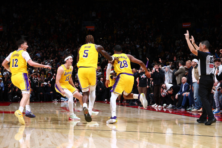 湖人最后一攻,里夫斯遭遇包夹,詹姆斯拿球后突破分球,精准传给底角空位的八村垒,后者三分压哨绝杀,詹姆斯激情怒吼并且张开双臂庆祝,还与队友撞胸庆祝,里夫斯抱着八村垒激情庆祝,湖人替补席众将都冲上球场,客场瞬间变成湖人全队狂欢的舞台。